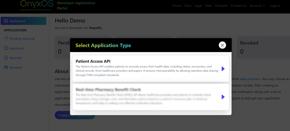 Click on the Create New Application button a dialog will appear prompting you to select type of application you want to create. Select Patient Access API.